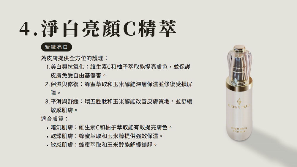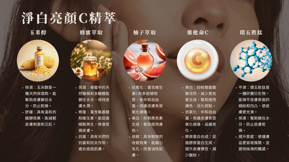 2. 主成分: 玉米醇、維生素C、蜂蜜萃取、蜂王乳複合萃取、柚子萃取、環五胜肽